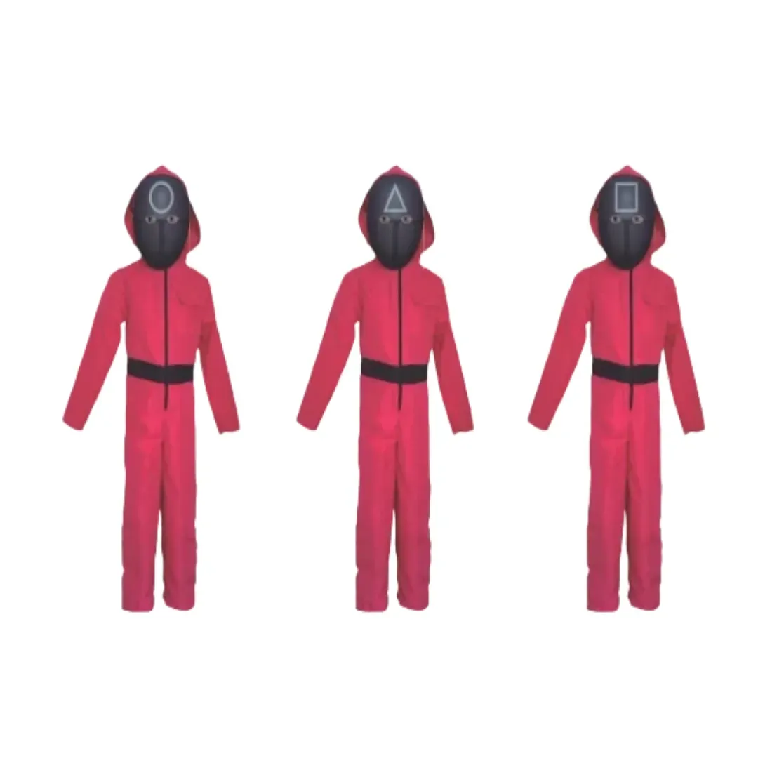 Tres personas con monos rojos y máscaras negras en sus rostros. Este conjunto es perfecto para eventos especiales, fiestas temáticas o actuaciones. Confeccionados con materiales de alta calidad, estos trajes llamarán la atención y agregarán un toque de misterio y estilo a cualquier ocasión.