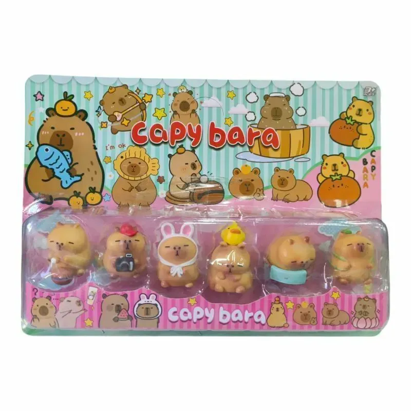 Conjunto de figuritas de carpincho en un paquete rosa, ideal para coleccionar o regalar a amantes de la fauna. Estas adorables piezas son perfectas para decorar tu hogar o escritorio con un toque de ternura y originalidad. ¡Hazte con este set único y sorprende a tus seres queridos!
