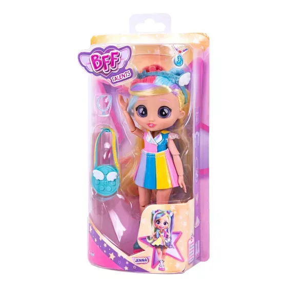¡Con la muñeca BFF Talents lucirás un vestido arcoíris deslumbrante y un bolso a juego! Esta muñeca es el complemento perfecto para horas de diversión y creatividad. ¡Colecciónala y vive aventuras inolvidables con tu mejor amiga!