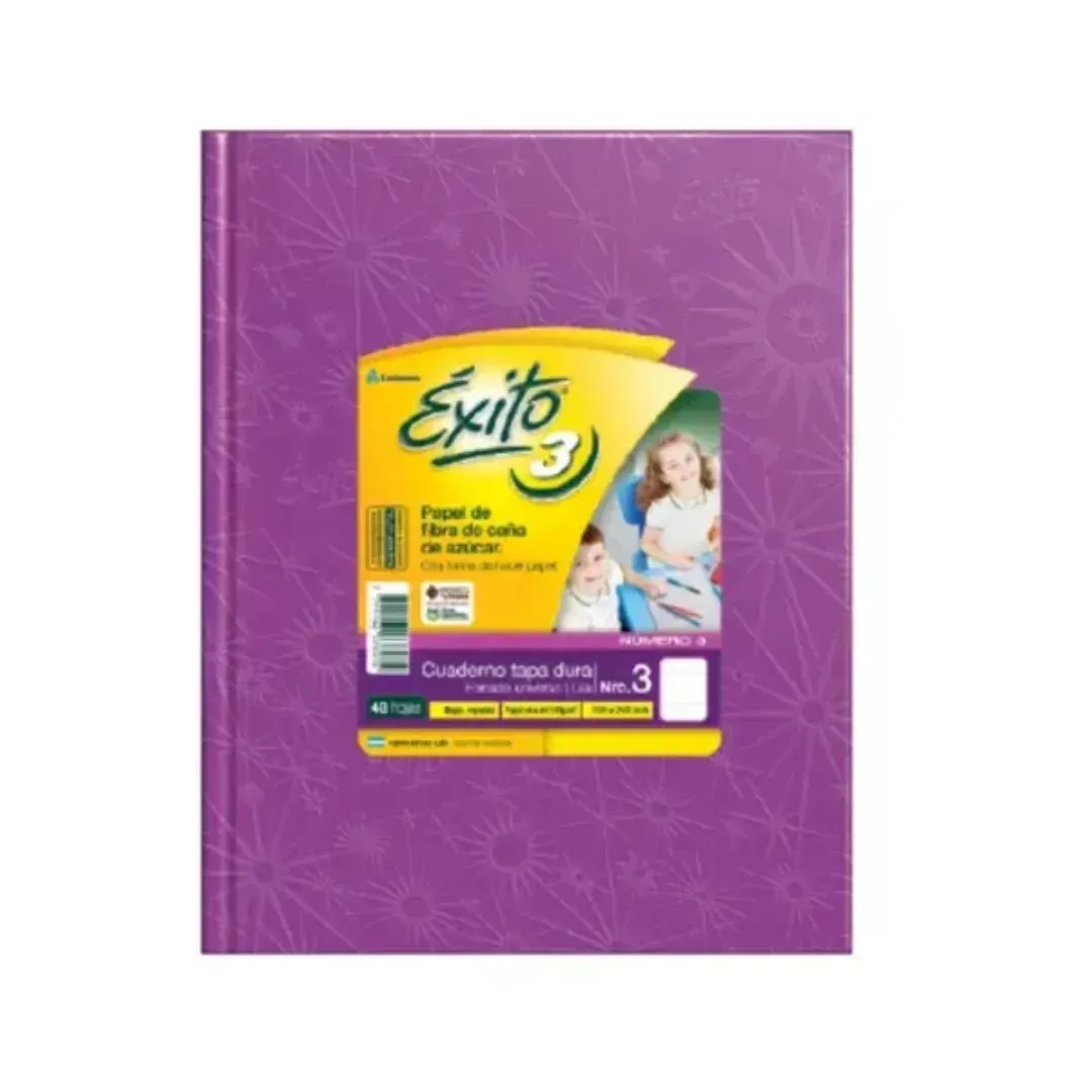 Cuaderno Exito 3 de color morado con etiqueta amarilla, ideal para tomar notas, hacer dibujos o planificar tu día. Su diseño llamativo te ayudará a destacarte en tus reuniones o en la escuela. ¡Lleva contigo este cuaderno de alta calidad y organiza tus ideas con estilo!