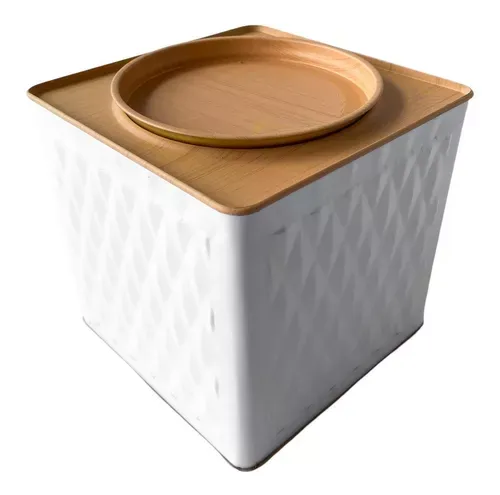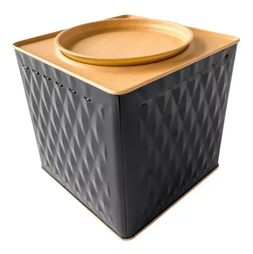 Una caja de metal negra con una bandeja de madera encima, ideal para organizar tus objetos con estilo y elegancia. Perfecta para añadir un toque moderno a tu hogar u oficina. ¡Hazte con esta pieza única y funcional hoy mismo!