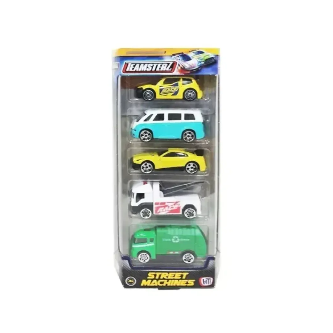 Un set de cinco autos de juguete en una caja llamada Street Machines. Perfecto para que los niños se diviertan creando carreras emocionantes y estimulando su imaginación. ¡Colecciónalos todos y disfruta de horas de juego creativo!